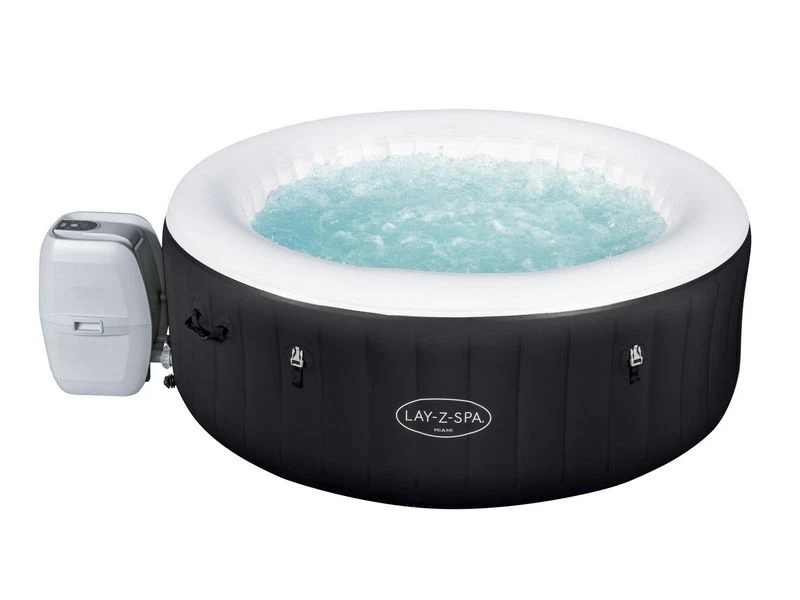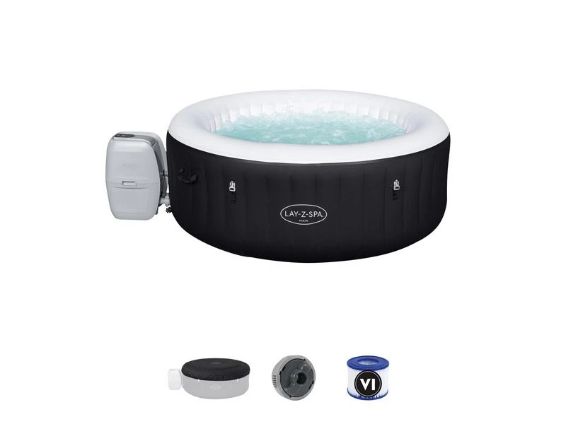 Opblaasbare ronde spa voor 2-4 personen. Zwarte buitenkant van DuraPlus materiaal en een liner met mozaïek print op de bodem. Pomp heeft een nieuw flip up controle paneelcontrolepaneel met modern touchscreen en klein plateau voor bekers enz. Pomp beschikt ook over Power Saving System (automatische start/stop timer) en Freeze shield (gaat automatisch aan onder 4° C). Het hele jaar door te gebruiken. Met ingebouwde drainagepijp en 2 handgrepen, opblaasbare cover, filtercartridge, reparatiepatch en een Chemconnect. Verhoogt de temperatuur met 1,5-2,0° C per uur. Max. temperatuur 40° C. Filtercapaciteit: 1,3 m³/u. Watercapaciteit: 669 ltr. CE/GS gekeurd. Afmeting buiten: Ø 180×66 cm, binnen: Ø 132 cm.