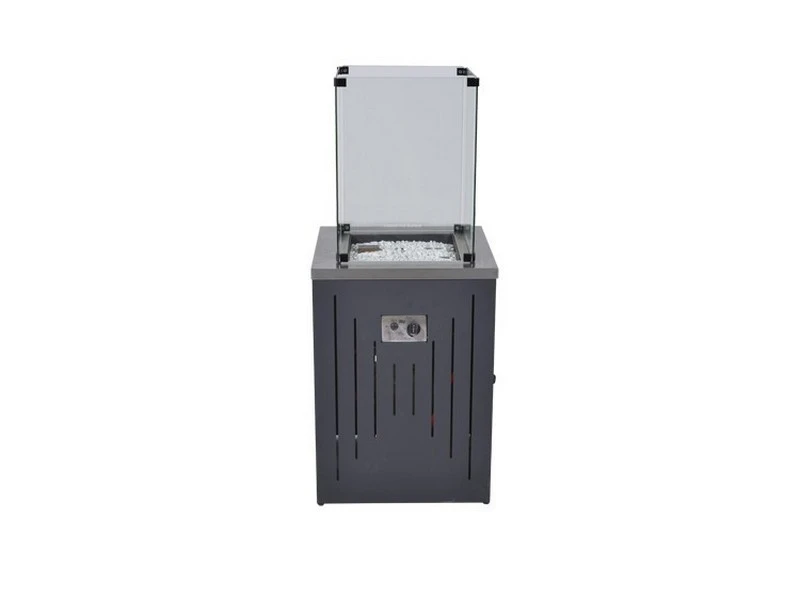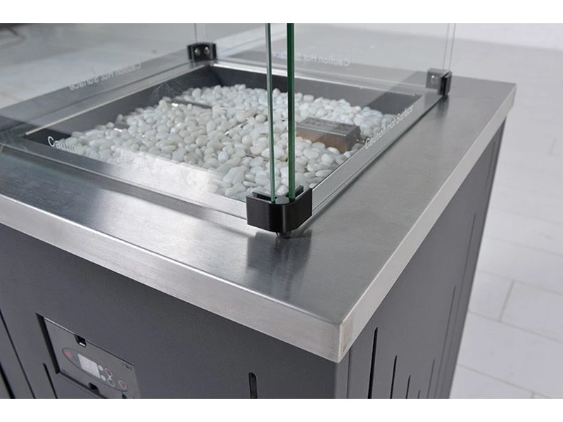 De vuurhaard heeft een aluminium behuizing, waar u de gasfles in kunt opbergen en is afgewerkt met een RVS blad. De brander is ook van RVS en is weg gewerkt met witte steentjes, welke standaard zijn inbegrepen. Voor extra veiligheid wordt de glazen ombouw ook meegeleverd. De bediening is zeer eenvoudig door de draaiknop.